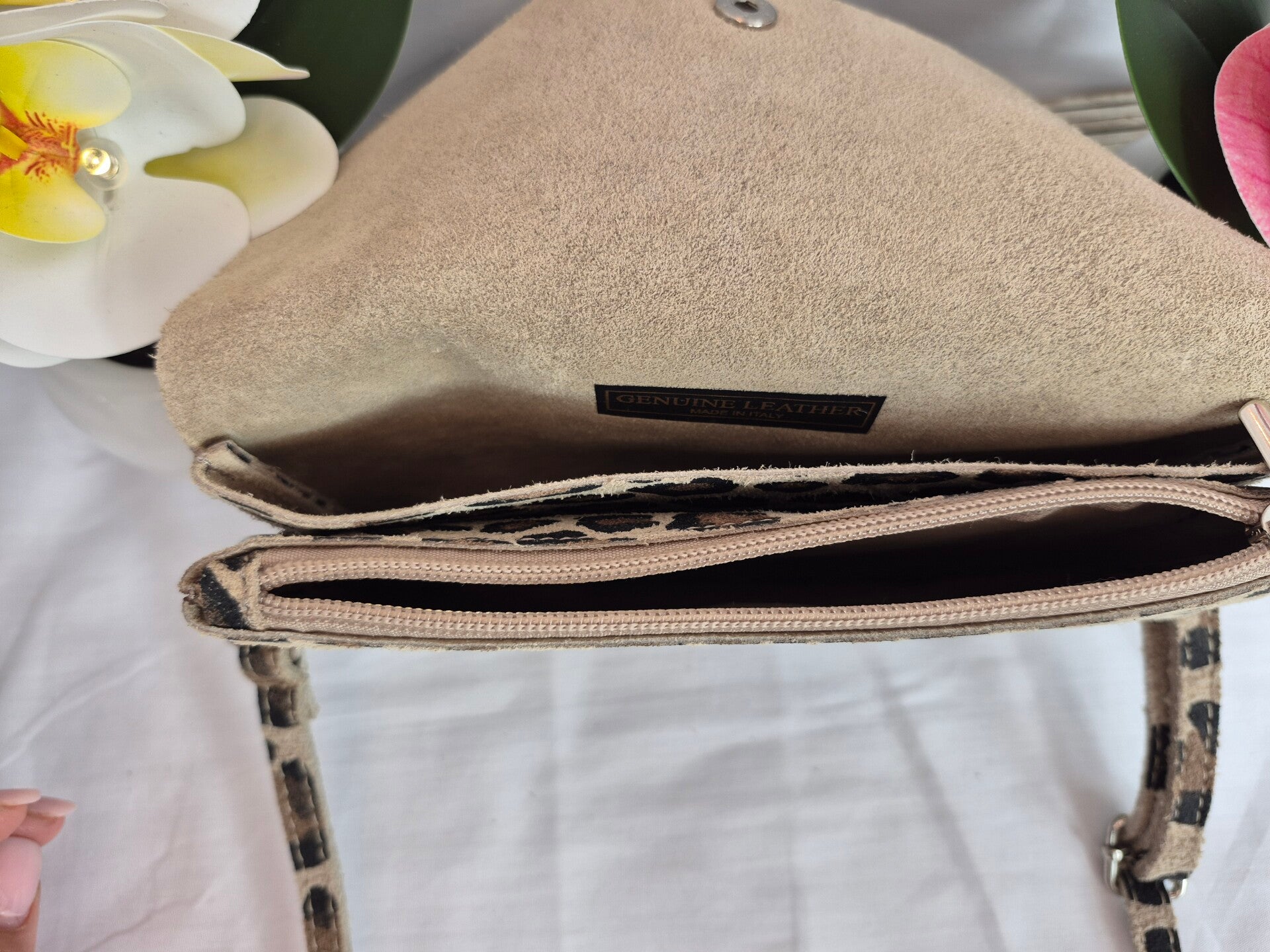Diese kleine süße Umhängetasche ist aus Wildleder hat insgesamt 3 Fäscher, aber einer mit Reissverschluss